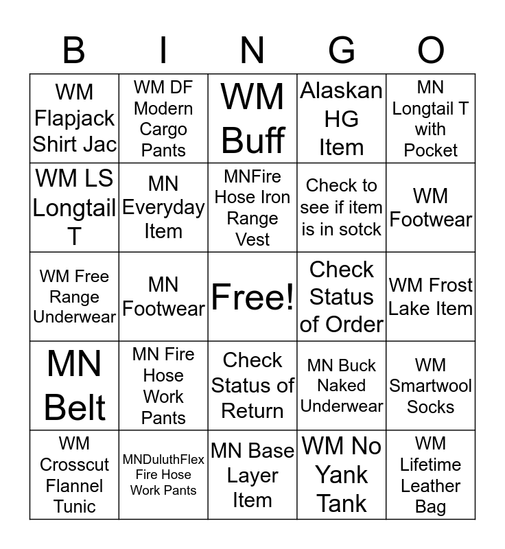 This bingo card has a free space and 24 words: MN Fire Hose Work Pants, MNDuluthFlex Fire Hose Work Pants, MNFire Hose Iron Range Vest, WM Crosscut Flannel Tunic, MN Longtail T with Pocket, WM Flapjack Shirt Jac, WM LS Longtail T, WM DF Modern Cargo Pants, Check Status of Order, Check Status of Return, Check to see if item is in sotck, WM Free Range Underwear, MN Buck Naked Underwear, WM Smartwool Socks, MN Everyday Item, WM No Yank Tank, WM Frost Lake Item, WM Buff, WM Footwear, MN Footwear, WM Lifetime Leather Bag, MN Belt, Alaskan HG Item and MN Base Layer Item.