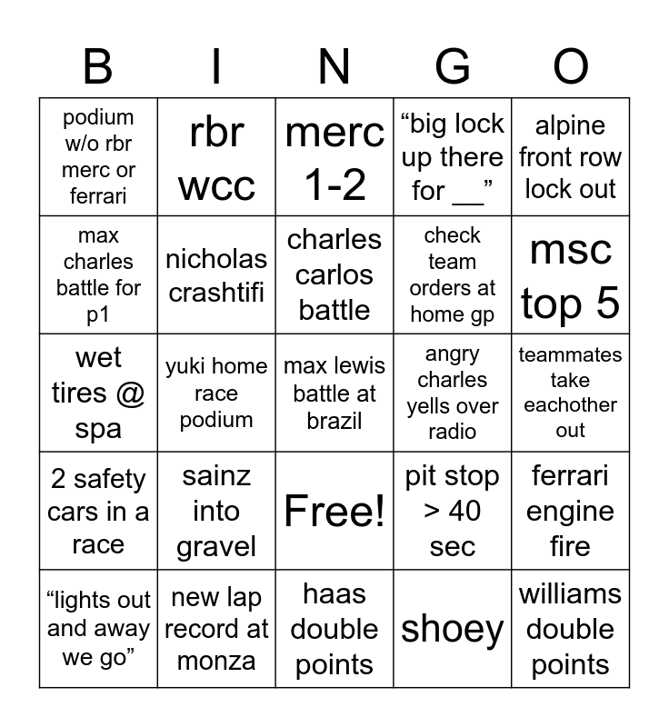 This bingo card has 26 words: Free!, shoey, charles carlos battle, new lap record at monza, alpine front row lock out, podium w/o rbr merc or ferrari, max charles battle for p1, rbr wcc, teammates take eachother out, pit stop > 40 sec, check team orders at home gp, wet tires @ spa, ferrari engine fire, “lights out and away we go”, yuki home race podium, 4 dnfs in a race, “big lock up there for __”, 2 safety cars in a race, merc 1-2, max lewis battle at brazil, msc top 5, haas double points, angry charles yells over radio, sainz into gravel, nicholas crashtifi and williams double points.