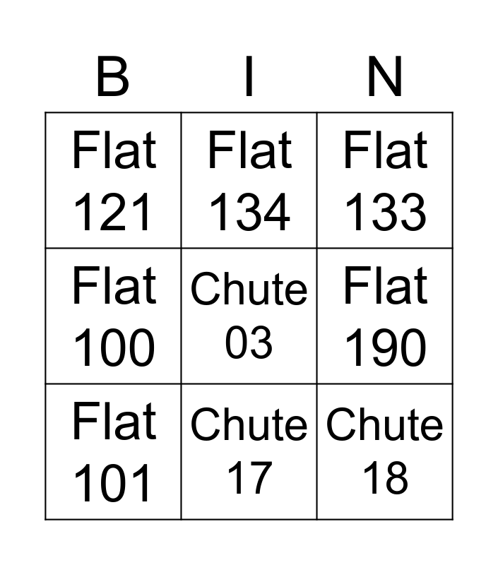 This bingo card has 21 words: Flat 128, Chute 13, Flat 134, Chute 12, Chute 32, Flat 101, Flat 121, Flat 133, Box 01, Chute 17, Chute 18, Flat 100, Flat 134, Chute 09, Flat 190, Chute 29, Chute 31, Chute 62A, Chute 03, Chute 05 and Flat 112.