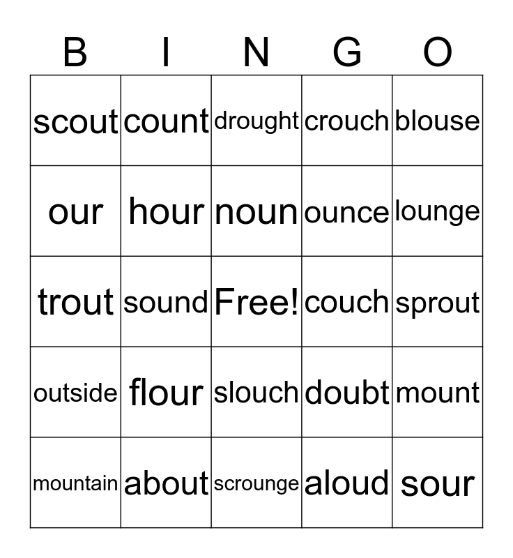 This bingo card has a free space and 24 words: flour, about, noun, mountain, blouse, scout, our, count, couch, slouch, ounce, trout, doubt, mount, hour, aloud, sprout, drought, lounge, sound, sour, outside, crouch and scrounge.