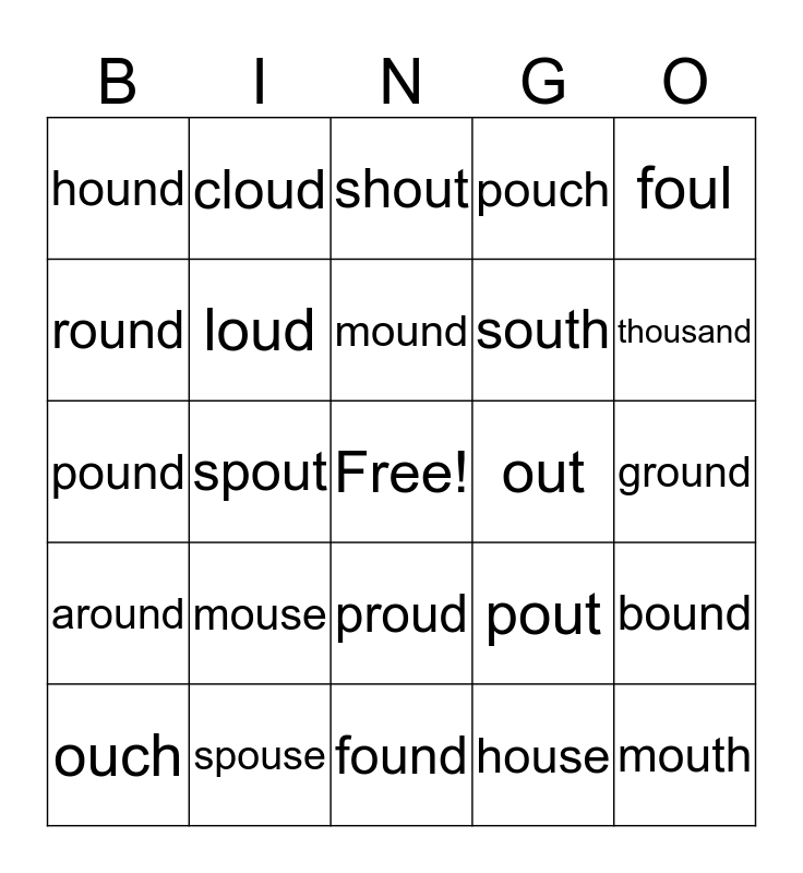 This bingo card has a free space and 24 words: mouse, spouse, mound, ouch, foul, hound, round, cloud, out, proud, south, pound, pout, bound, loud, house, ground, shout, thousand, spout, mouth, around, pouch and found.