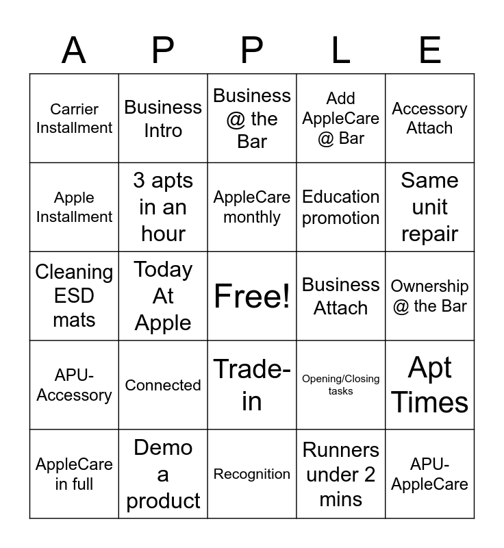 This bingo card has a free space and 24 words: Connected, Demo a product, AppleCare monthly, AppleCare in full, Accessory Attach, Carrier Installment, Apple Installment, Business Intro, Business Attach, Trade-in, Education promotion, Cleaning ESD mats, Opening/Closing tasks, Apt Times, 3 apts in an hour, Runners under 2 mins, Ownership @ the Bar, Business @ the Bar, Same unit repair, Today At Apple, APU-AppleCare, APU-Accessory, Add AppleCare @ Bar and Recognition.
