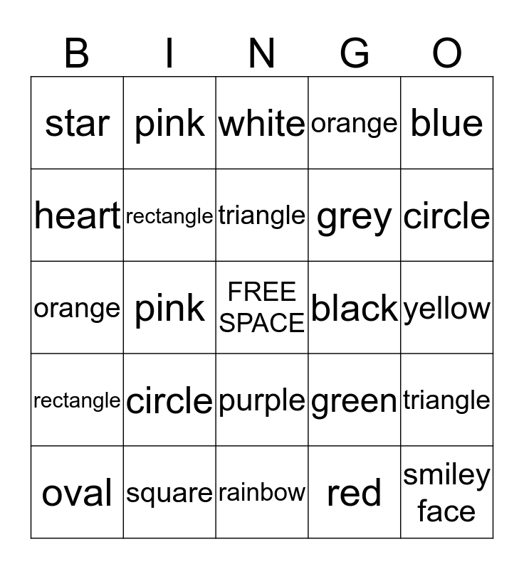 This bingo card has a free space and 24 words: circle, square, triangle, oval, blue, star, heart, pink, black, purple, grey, orange, green, triangle, rectangle, red, yellow, white, circle, pink, smiley face, rectangle, orange and rainbow.