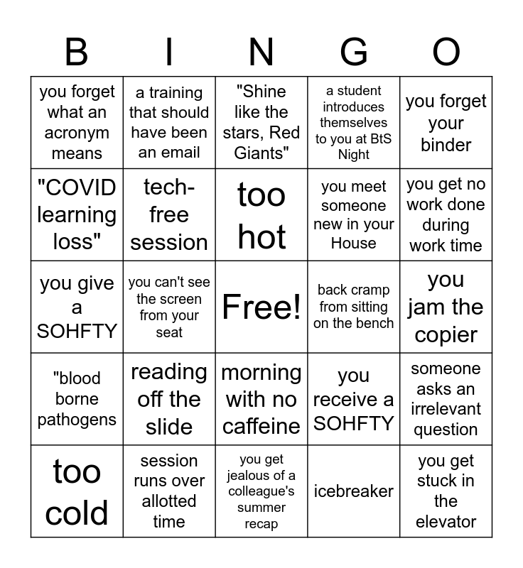 This bingo card has a free space and 24 words: reading off the slide, session runs over allotted time, too hot, too cold, you forget your binder, you forget what an acronym means, "COVID learning loss", a training that should have been an email, back cramp from sitting on the bench, morning with no caffeine, you meet someone new in your House, you give a SOHFTY, you receive a SOHFTY, someone asks an irrelevant question, tech-free session, icebreaker, you jam the copier, "Shine like the stars, Red Giants", you get no work done during work time, you can't see the screen from your seat, you get stuck in the elevator, "blood borne pathogens, a student introduces themselves to you at BtS Night and you get jealous of a colleague's summer recap.