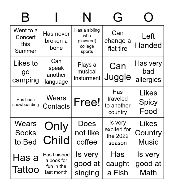 This bingo card has a free space and 24 words: Only Child, Has finished a book for fun in the last month, Plays a musical Insturment, Has a Tattoo, Left Handed, Went to a Concert this Summer, Likes to go camping, Has never broken a bone, Has traveled to another country, Does not like coffee, Can Juggle, Has been snowboarding, Is very excited for the 2022 season, Likes Country Music, Can speak another language, Has caught a Fish, Likes Spicy Food, Has a sibling who plays(ed) college sports, Has very bad allergies, Wears Contacts, Is very good at Math, Wears Socks to Bed, Can change a flat tire and Is very good at singing.