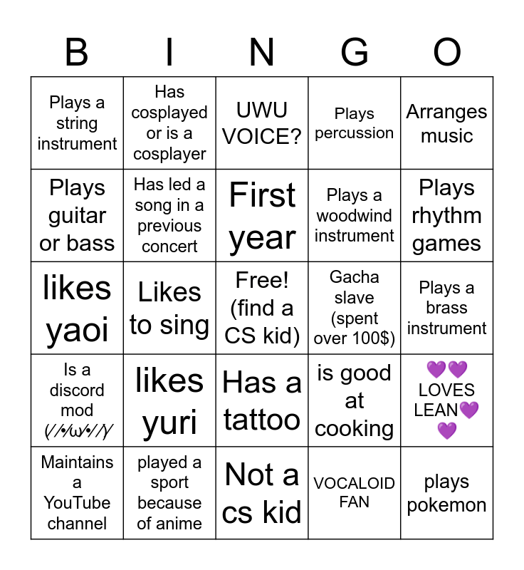 This bingo card has a free space and 33 words: Likes goldfish and milk, Has a body pillow, Likes to sing, Plays league π€’, Is a discord mod (β ββ’βΟββ’β β)β, Has led a song in a previous concert, Arranges music, Maintains a YouTube channel, Has cosplayed or is a cosplayer, Is older than 25π΄, First year, UWU VOICE?, Can do the splits, Likes vtubers, Gacha slave (spent over 100$), Plays rhythm games, played a sport because of anime, likes yaoi, likes yuri, is good at cooking, Has a tattoo, Has been to japan, Plays a string instrument, Plays a brass instrument, Not a cs kid, plays pokemon, Plays percussion, Plays a woodwind instrument, Plays guitar or bass, ππLOVES LEANππ, LIKES TOUHOU, VOCALOID FAN and PLAYS VALORANT π€’π€’.