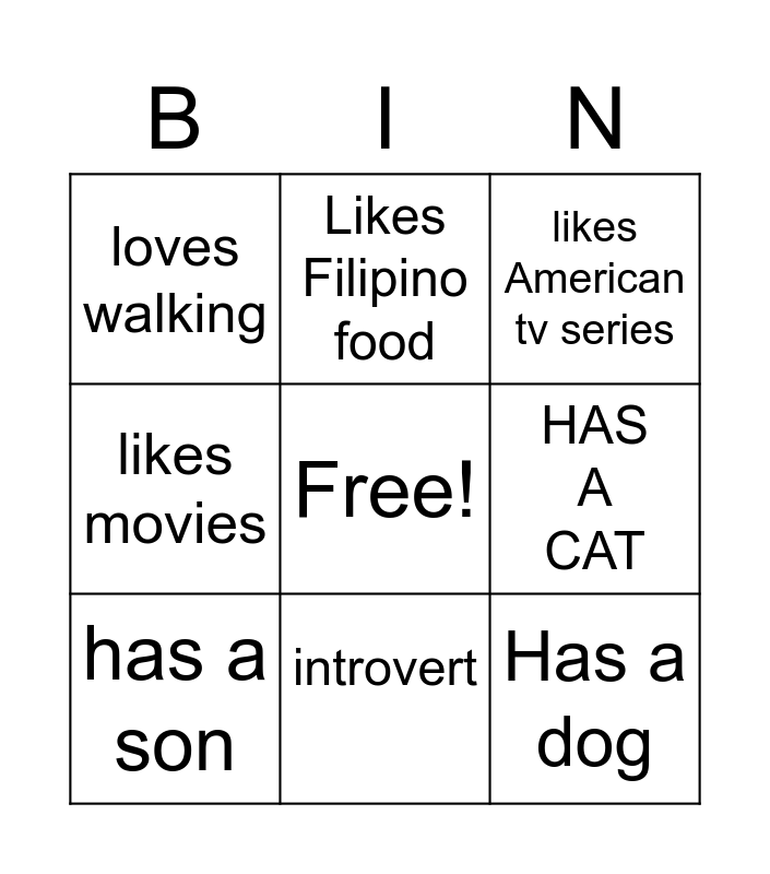This bingo card has a free space and 8 words: HAS A CAT, likes American tv series, Likes Filipino food, has a son, loves walking, Has a dog, likes movies and introvert.