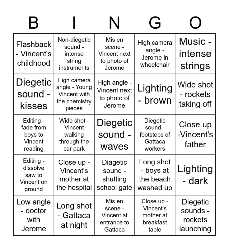 This bingo card has a free space and 24 words: Close up -Vincent's mother at the hospital, Long shot - Gattaca at night, High angle - Vincent next to photo of Jerome, Low angle - doctor with Jerome, Music - intense strings, Flashback - Vincent's childhood, Diegetic sound - kisses, Non-diegetic sound - intense string instruments, Diegetic sound - footsteps of Gattaca workers, Diagetic sound - shutting school gate, Lighting - brown, Editing - fade from boys to Vincent reading, Long shot - boys at the beach washed up, Lighting - dark, High camera angle - Young Vincent with the chemistry pieces, Close up - Vincent's mother at breakfast table, Close up -Vincent's father, Mis en scene - Vincent next to photo of Jerome, Wide shot - rockets taking off, Wide shot - Vincent walking through the car park, Diegetic sounds - rockets launching, Editing - dissolve saw to Vincent on ground, High camera angle - Jerome in wheelchair and Mis en scene - Vincent at entrance to Gattaca.