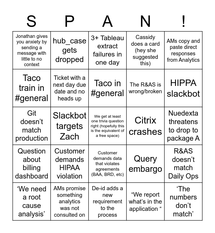 This bingo card has a free space and 44 words: ‘A severe error occurred on the current command. The results, if any, should be discarded.’, ‘The numbers don’t match’, ‘Urgent’ client request, ‘We need a root cause analysis’, ‘You have to run this in RPT2’, “We report what’s in the application “, 3+ Tableau extract failures in one day, 4+ questions in #amp-data-hypercare in one day, AMs copy and paste direct responses from Analytics, AMs promise something analytics was not consulted on, Cassidy does a card (hey she suggested this), Citrix crashes, Customer demands data that violates agreements (BAA, BRD, etc), Customer demands HIPAA violation, Datafeeds be datafeeding, De-id adds a new requirement to the process, De-id rejects something they previously approved, Git doesn’t match production, Go Mavs!, HIPPA slackbot, hub_case gets dropped, hub_case_item_history gets dropped, Jobs fail, Jonathan gives you anxiety by sending a message with little to no context, Last minute request for a QBR (which is tomorrow), Nuedexta threatens to drop to package A, NVS SSRS reports didn’t send, PR WIP limit reached, Query embargo, Question about billing dashboard, Question about case vs. request level metrics, R&AS doesn’t match Daily Ops, Sales promises something analytics was not consulted on, Slackbot targets Austin, Slackbot targets Zach, Someone drops or truncates report_sf_daily, Someone on PTO gets called to lead standup, Tableau is down, Taco in #general, Taco train in #general, The R&AS is wrong/broken, Ticket not submitted through service desk, Ticket with a next day due date and no heads up and VPN issues.