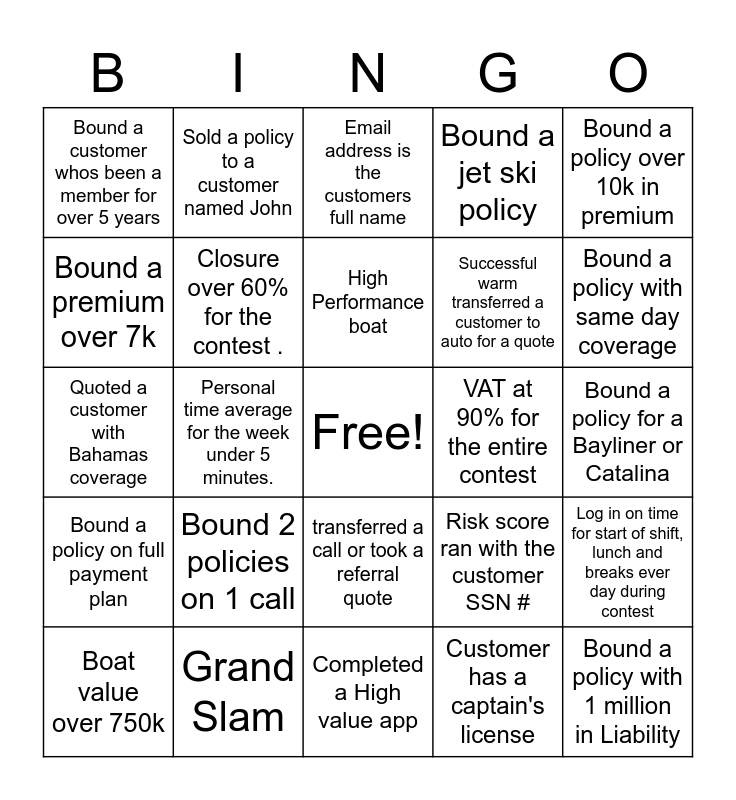 This bingo card has a free space and 24 words: Bound 2 policies on 1 call, Grand Slam, High Performance boat, Boat value over 750k, Bound a policy over 10k in premium, Bound a customer whos been a member for over 5 years, Bound a premium over 7k, Sold a policy to a customer named John, VAT at 90% for the entire contest, transferred a call or took a referral quote, Successful warm transferred a customer to auto for a quote, Quoted a customer with Bahamas coverage, Risk score ran with the customer SSN #, Log in on time for start of shift, lunch and breaks ever day during contest, Closure over 60% for the contest ., Customer has a captain's license, Bound a policy for a Bayliner or Catalina, Email address is the customers full name, Bound a policy with same day coverage, Personal time average for the week under 5 minutes., Bound a policy with 1 million in Liability, Bound a policy on full payment plan, Bound a jet ski policy and Completed a High value app.