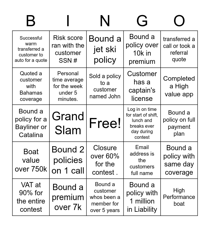 This bingo card has a free space and 24 words: Bound 2 policies on 1 call, Bound a premium over 7k, Sold a policy to a customer named John, VAT at 90% for the entire contest, transferred a call or took a referral quote, Successful warm transferred a customer to auto for a quote, Quoted a customer with Bahamas coverage, Risk score ran with the customer SSN #, Log in on time for start of shift, lunch and breaks ever day during contest, Closure over 60% for the contest ., Customer has a captain's license, Bound a policy for a Bayliner or Catalina, Email address is the customers full name, Bound a policy with same day coverage, Personal time average for the week under 5 minutes., Bound a policy with 1 million in Liability, Bound a policy on full payment plan, Bound a jet ski policy, Completed a High value app, Grand Slam, High Performance boat, Boat value over 750k, Bound a policy over 10k in premium and Bound a customer whos been a member for over 5 years.