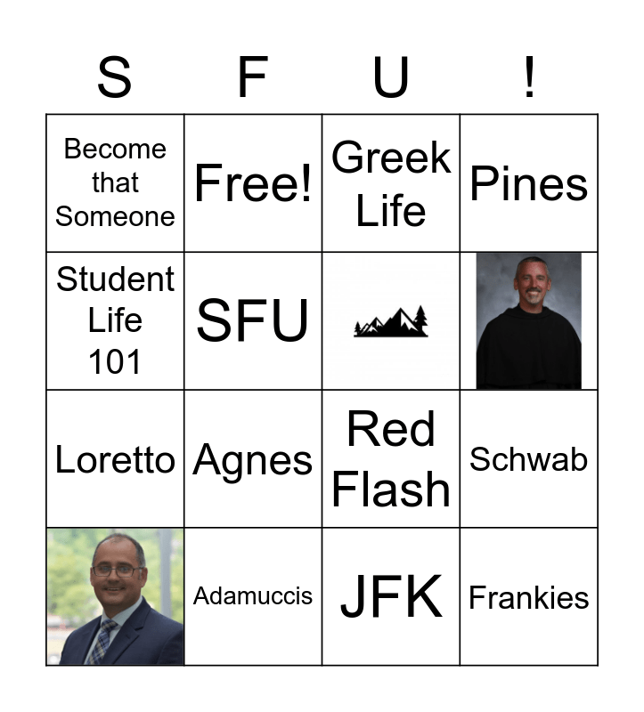 This bingo card has 9 images and 23 words: SFU, Schwab, Frankies, Student Life 101, Torvian, Free!, Randy Frye, Greek Life, Become That Someone, Adamuccis, OC, Red Flash, Maurice Stokes, Disepio, Giles, JFK, The Gardens, Pines, Loretto, SFU, Become that Someone, Francis and Agnes.