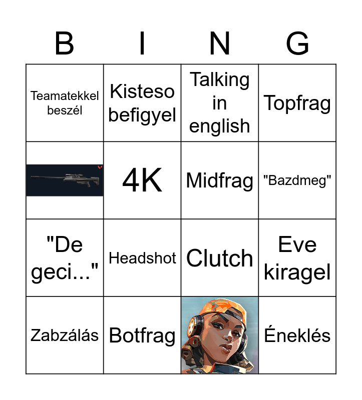 This bingo card has 2 images and 14 words: Botfrag, Eve kiragel, Talking in english, Teamatekkel beszél, "De geci...", Kisteso befigyel, Clutch, 4K, Zabzálás, Topfrag, Headshot, "Bazdmeg", Midfrag and Éneklés.
