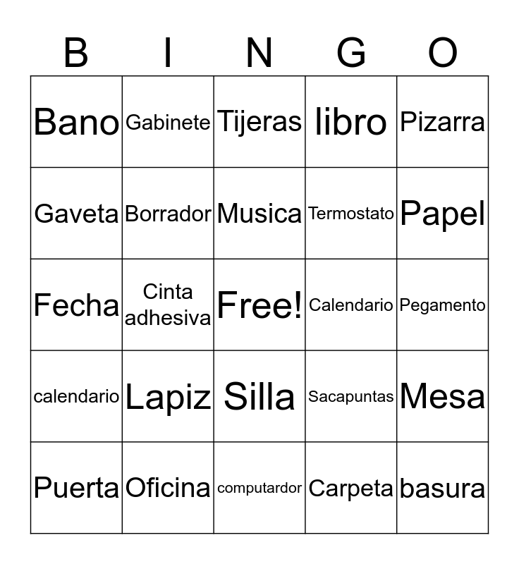 This bingo card has a free space and 24 words: Lapiz, Oficina, Musica, Puerta, Pizarra, Bano, Gaveta, Gabinete, Calendario, Silla, Termostato, Fecha, Sacapuntas, Mesa, Borrador, Carpeta, Pegamento, Tijeras, Papel, Cinta adhesiva, basura, calendario, libro and computardor.