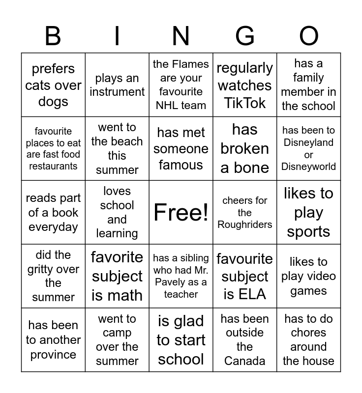 This bingo card has a free space and 24 words: favorite subject is math, went to camp over the summer, has met someone famous, has been to another province, has a family member in the school, prefers cats over dogs, favourite places to eat are fast food restaurants, plays an instrument, cheers for the Roughriders, has a sibling who had Mr. Pavely as a teacher, has broken a bone, reads part of a book everyday, favourite subject is ELA, likes to play video games, went to the beach this summer, has been outside the Canada, likes to play sports, the Flames are your favourite NHL team, has been to Disneyland or Disneyworld, loves school and learning, has to do chores around the house, did the gritty over the summer, regularly watches TikTok and is glad to start school.