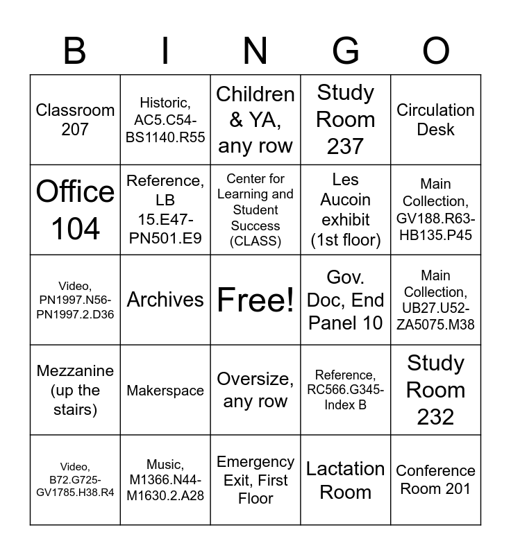 This bingo card has a free space and 24 words: Makerspace, Music, M1366.N44-M1630.2.A28, Center for Learning and Student Success (CLASS), Video, B72.G725-GV1785.H38.R4, Circulation Desk, Classroom 207, Office 104, Historic, AC5.C54-BS1140.R55, Gov. Doc, End Panel 10, Oversize, any row, Les Aucoin exhibit (1st floor), Video, PN1997.N56-PN1997.2.D36, Reference, RC566.G345-Index B, Study Room 232, Reference, LB 15.E47-PN501.E9, Lactation Room, Main Collection, UB27.U52-ZA5075.M38, Children & YA, any row, Main Collection, GV188.R63-HB135.P45, Archives, Conference Room 201, Mezzanine (up the stairs), Study Room 237 and Emergency Exit, First Floor.