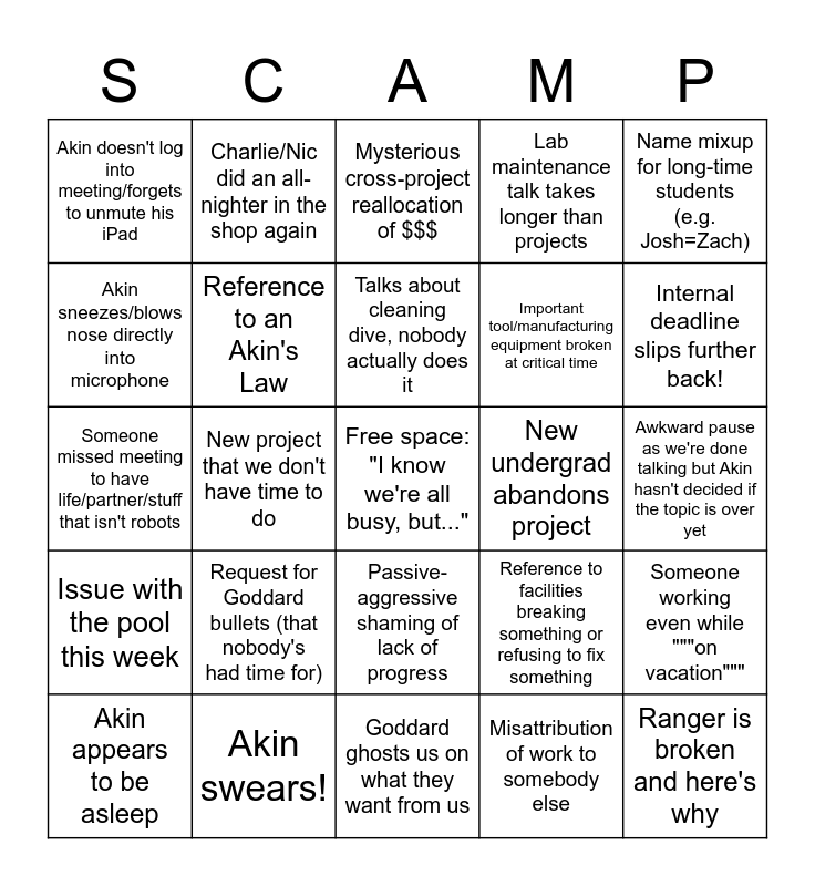 This bingo card has a free space and 39 words: "We need to get [this project we're all working overtime on] done by [deadline we all know]", Galil/electronics talk nobody understands but it sounds neat, Akin forgets software again, Reference to an Akin's Law, Akin appears to be asleep, Passive-aggressive shaming of lack of progress, Talks about cleaning dive, nobody actually does it, Relevant undergrad mysteriously absent, Name mixup for long-time students (e.g. Josh=Zach), Issue with the pool this week, New project that we don't have time to do, Lab maintenance talk takes longer than projects, Ranger is broken and here's why, Awkward pause as we're done talking but Akin hasn't decided if the topic is over yet, New undergrad abandons project, Request for Goddard bullets (that nobody's had time for), Josh references ETH Zurich, Akin doesn't log into meeting/forgets to unmute his iPad, Someone names a random part number that they absolutely should not know from memory, Reference to facilities breaking something or refusing to fix something, Akin sneezes/blows nose directly into microphone, Goddard ghosts us on what they want from us, Important tool/manufacturing equipment broken at critical time, Internal deadline slips further back!, Reference to/request for no-cost extension, Reference to falling behind in classes bc of lab work, Someone jumps from the loud squeaking from the ventilation in the meeting room, ML/neural network joke, Shipping time woes, Charlie/Nic did an all-nighter in the shop again, Storytime with Dave!, Mention of old lab member who graduated before anyone else arrived, Mysterious cross-project reallocation of $$$, Akin swears!, Misattribution of work to somebody else, Akin traveling, Someone working even while """on vacation""", Someone missed meeting to have life/partner/stuff that isn't robots and somebody's horribly sick but still called in!.