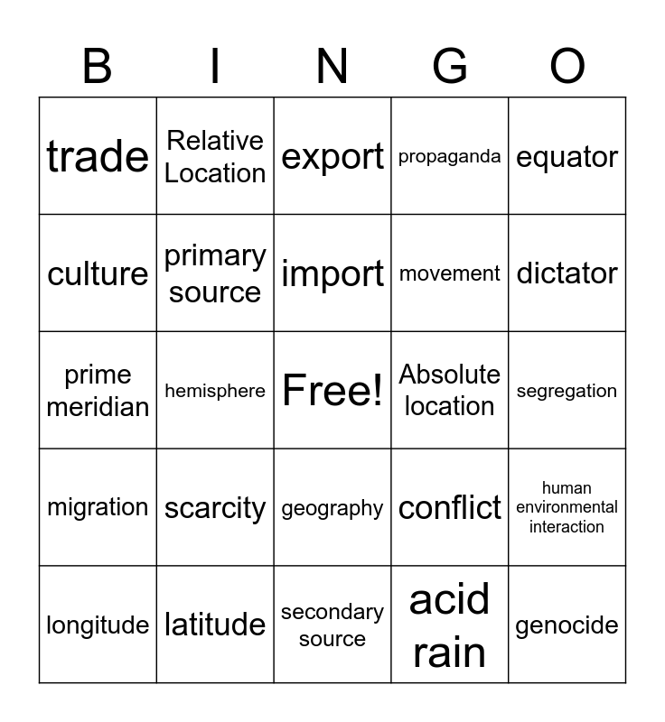 This bingo card has a free space and 24 words: scarcity, latitude, import, longitude, equator, trade, culture, Relative Location, Absolute location, geography, movement, prime meridian, conflict, human environmental interaction, primary source, acid rain, segregation, export, dictator, hemisphere, genocide, migration, propaganda and secondary source.