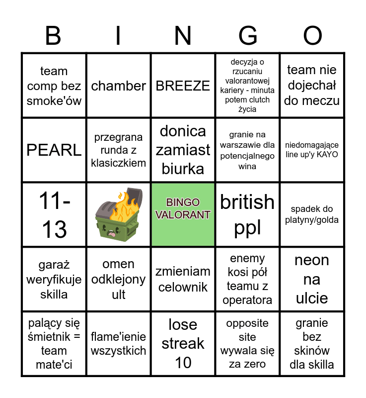 This bingo card has 1 images, a free space and 23 words: omen odklejony ult, flame'ienie wszystkich, donica zamiast biurka, palący się śmietnik = team mate'ci, team nie dojechał do meczu, team comp bez smoke'ów, PEARL, chamber, british ppl, zmieniam celownik, granie na warszawie dla potencjalnego wina, 11-13, enemy kosi pół teamu z operatora, neon na ulcie, przegrana runda z klasiczkiem, opposite site wywala się za zero, spadek do platyny/golda, BREEZE, niedomagające line up'y KAYO, granie bez skinów dla skilla, garaż weryfikuje skilla, decyzja o rzucaniu valorantowej kariery - minuta potem clutch życia and lose streak 10.