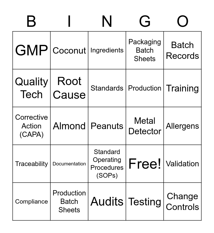 This bingo card has 25 words: Documentation, Audits, Standards, Compliance, Batch Records, GMP, Quality Tech, Coconut, Metal Detector, Standard Operating Procedures (SOPs), Production, Corrective Action (CAPA), Free!, Validation, Root Cause, Change Controls, Allergens, Ingredients, Training, Almond, Peanuts, Production Batch Sheets, Traceability, Packaging Batch Sheets and Testing.