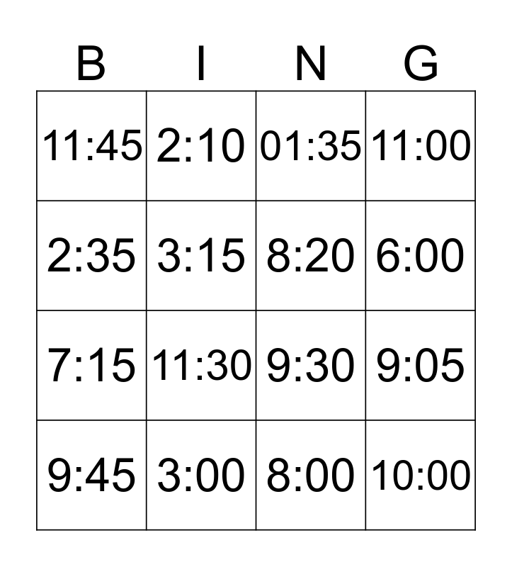 This bingo card has a free space and 15 words: 9:45, 10:00, 01:35, 11:45, 6:00, 2:35, 11:30, 8:00, 3:15, 7:15, 9:05, 11:00, 8:20, 2:10 and 3:00.