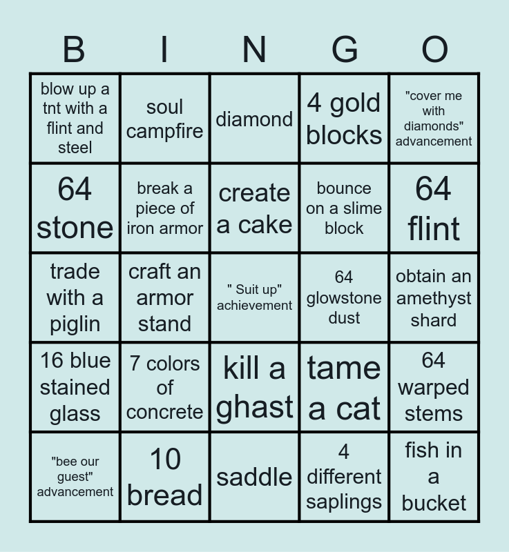 This bingo card has a free space and 24 words: "bee our guest" advancement, 7 colors of concrete, create a cake, 4 different saplings, "cover me with diamonds" advancement, blow up a tnt with a flint and steel, soul campfire, diamond, 64 glowstone dust, obtain an amethyst shard, trade with a piglin, break a piece of iron armor, tame a cat, 64 warped stems, 64 stone, 10 bread, saddle, 4 gold blocks, 64 flint, 16 blue stained glass, craft an armor stand, kill a ghast, bounce on a slime block and fish in a bucket.