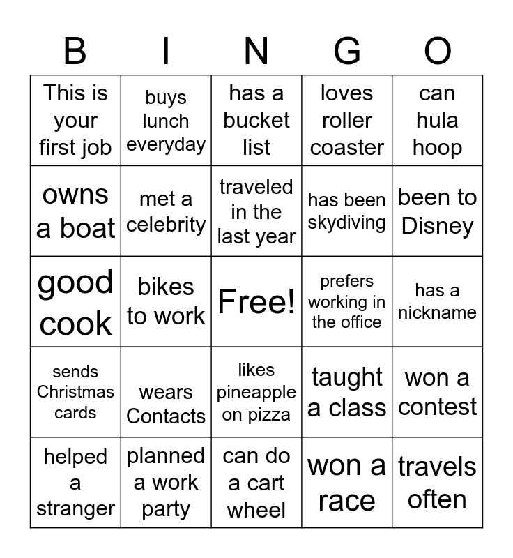 This bingo card has a free space and 24 words: wears Contacts, planned a work party, traveled in the last year, helped a stranger, can hula hoop, This is your first job, owns a boat, buys lunch everyday, prefers working in the office, likes pineapple on pizza, has been skydiving, good cook, taught a class, won a contest, met a celebrity, won a race, has a nickname, has a bucket list, been to Disney, bikes to work, travels often, sends Christmas cards, loves roller coaster and can do a cart wheel.
