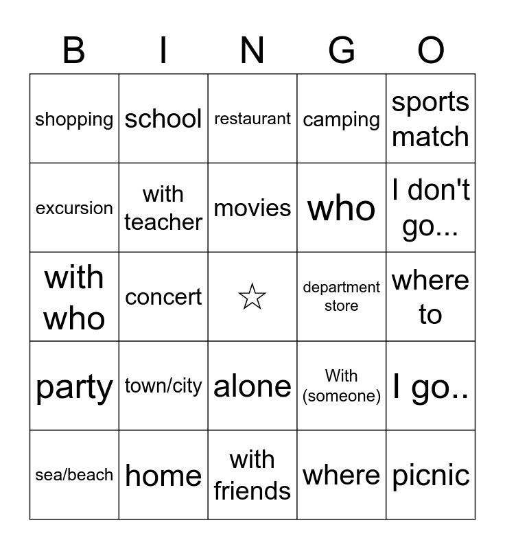 This bingo card has a free space and 24 words: town/city, home, movies, sea/beach, sports match, shopping, excursion, school, department store, alone, who, with who, With (someone), I go.., with teacher, where, where to, restaurant, I don't go..., concert, picnic, party, camping and with friends.