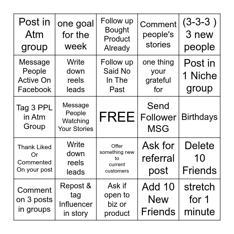 This bingo card has a free space and 24 words: Write down reels leads, Repost & tag Influencer in story, Follow up Said No In The Past, Comment on 3 posts in groups, (3-3-3 ) 3 new people, Post in Atm group, Message People Active On Facebook, one goal for the week, Send Follower MSG, Offer something new to current customers, one thing your grateful for, Tag 3 PPL in Atm Group, Ask for referral post, Delete 10 Friends, Write down reels leads, Add 10 New Friends, Birthdays, Follow up Bought Product Already, Post in 1 Niche group, Message People Watching Your Stories, stretch for 1 minute, Thank Liked Or Commented On your post, Comment people's stories and Ask if open to biz or product.