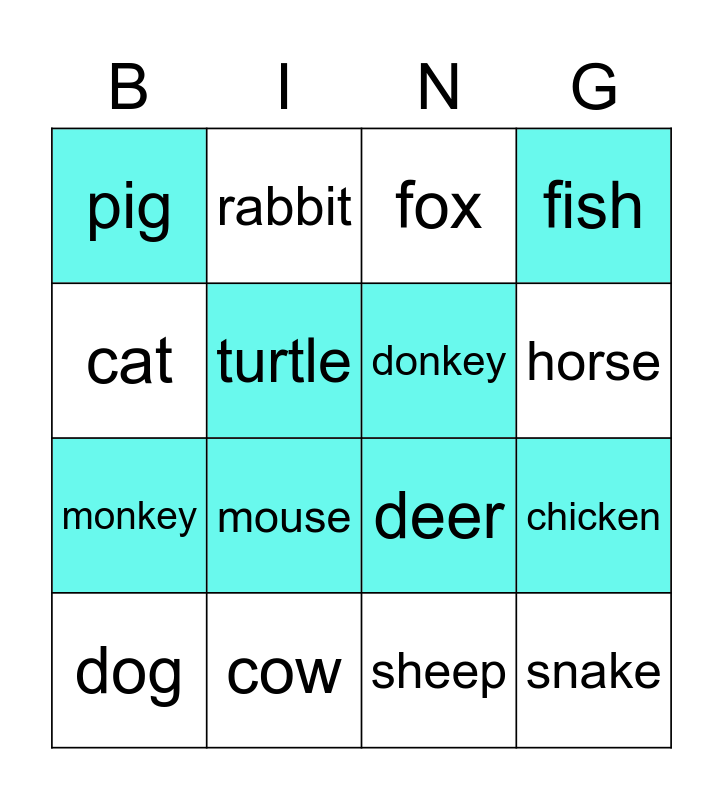 This bingo card has 16 words: cow, chicken, fox, pig, monkey, rabbit, deer, sheep, cat, turtle, dog, fish, mouse, horse, donkey and snake.