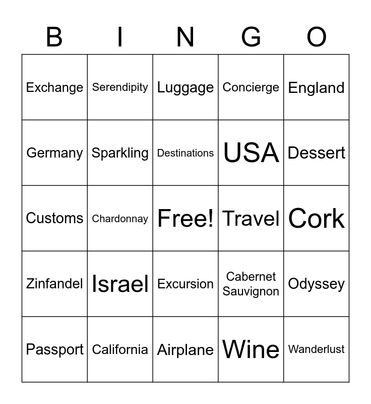 This bingo card has a free space and 29 words: Passport, Brazil, Chardonnay, Language, Exchange, Luggage, Sparkling, Israel, Travel, California, Cork, Wanderlust, Airplane, Wine, Dessert, Africa, Excursion, Zinfandel, England, Customs, Cabernet Sauvignon, Mexico, USA, Germany, Concierge, Serendipity, Odyssey, Destinations and Take Off.