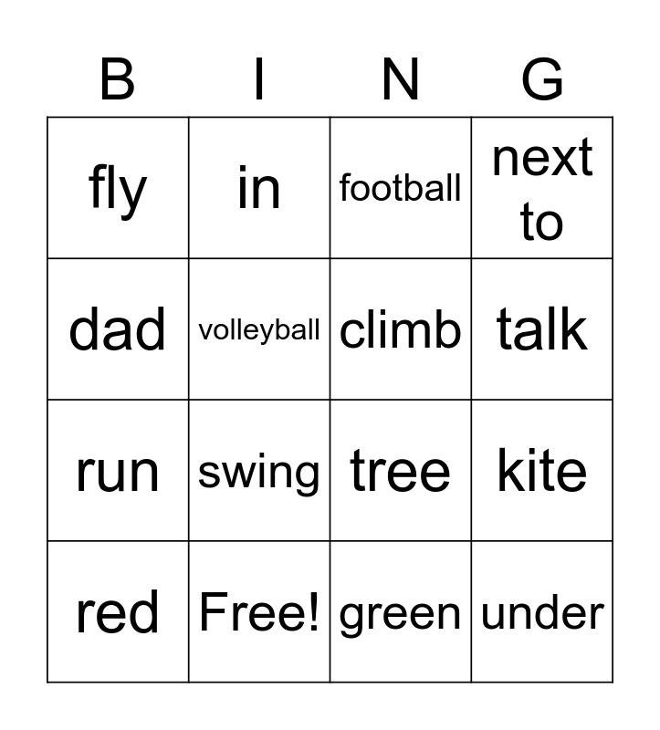 This bingo card has 28 words: play, jumb, run, tennis, volleyball, football, in, under, Free!, ball, tree, next to, slide, net, swing, on, swim, climb, talk, bird, fly, dog, red, kite, green, fig, dad and hat.