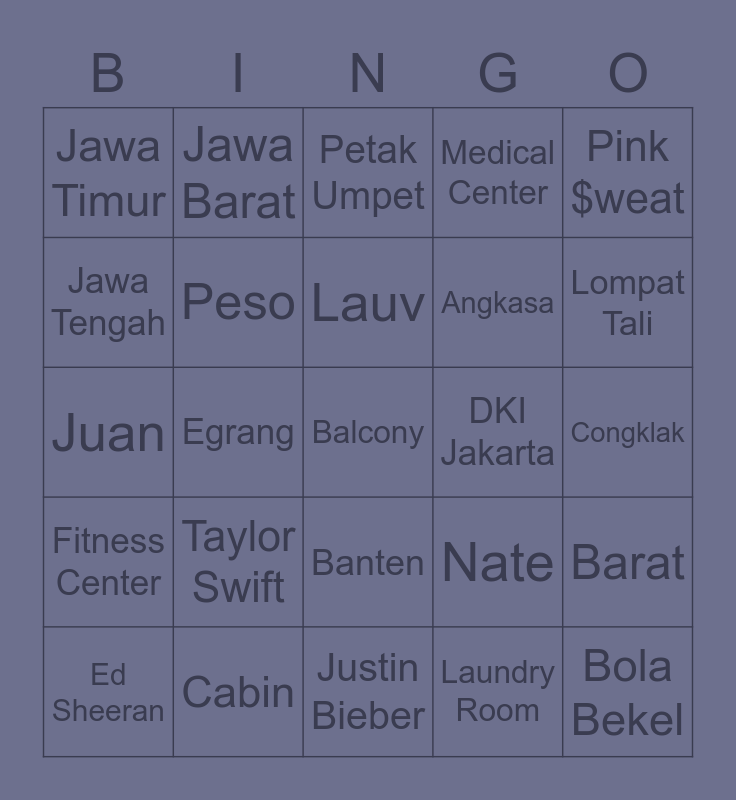 This bingo card has 25 words: Taylor Swift, Justin Bieber, Lauv, Ed Sheeran, Pink $weat, Jawa Timur, Jawa Tengah, Jawa Barat, DKI Jakarta, Banten, Angkasa, Juan, Nate, Barat, Peso, Bola Bekel, Congklak, Petak Umpet, Lompat Tali, Egrang, Balcony, Cabin, Fitness Center, Medical Center and Laundry Room.