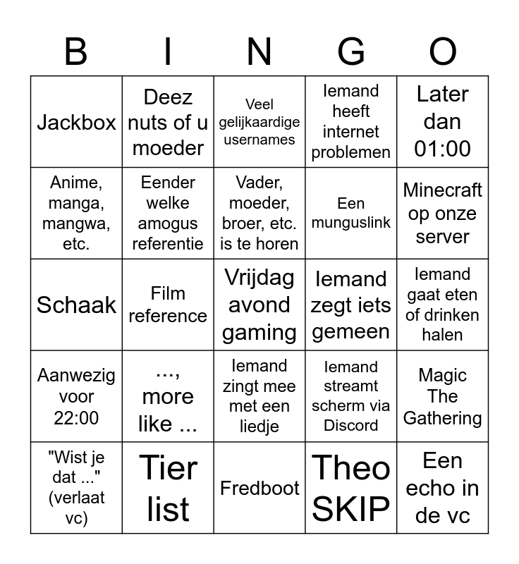 This bingo card has a free space and 30 words: Tier list, Allemaal aanwezig, Film reference, Wordle, Jackbox, Veel gelijkaardige usernames, Eender welke amogus referentie, Iemand zingt mee met een liedje, Iemand zegt iets gemeen, Fredboot, Iemand gaat eten of drinken halen, Een echo in de vc, Theo SKIP, Hypixel Minecraft, Minecraft op onze server, Ik ben ..., "hallo ... ik ben ...", Iemand streamt scherm via Discord, Aanwezig voor 22:00, ..., more like ..., Later dan 01:00, Schaak, Iemand te laat door film, Deez nuts of u moeder, Een munguslink, Anime, manga, mangwa, etc., Iemand heeft internet problemen, Magic The Gathering, "Wist je dat ..." (verlaat vc), Vader, moeder, broer, etc. is te horen and "Hallo?".