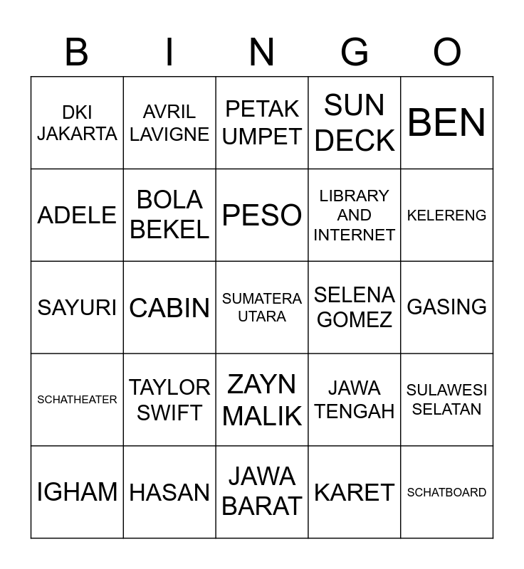 This bingo card has a free space and 24 words: TAYLOR SWIFT, HASAN, PESO, IGHAM, BEN, DKI JAKARTA, ADELE, AVRIL LAVIGNE, SELENA GOMEZ, ZAYN MALIK, LIBRARY AND INTERNET, SAYURI, JAWA TENGAH, SULAWESI SELATAN, BOLA BEKEL, KARET, GASING, PETAK UMPET, KELERENG, CABIN, SCHATBOARD, SCHATHEATER, SUN DECK and JAWA BARAT.