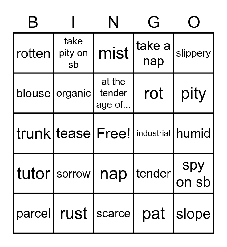 This bingo card has a free space and 29 words: parcel, pollute, tease, steep, rotten, mist, organic, sorrow, industrial, rust, humid, slope, scarce, pat, pity, scout, nap, tutor, slippery, trunk, tender, shepherd, rot, blouse, take a nap, take pity on sb, spy on sb, at the tender age of... and industrious.