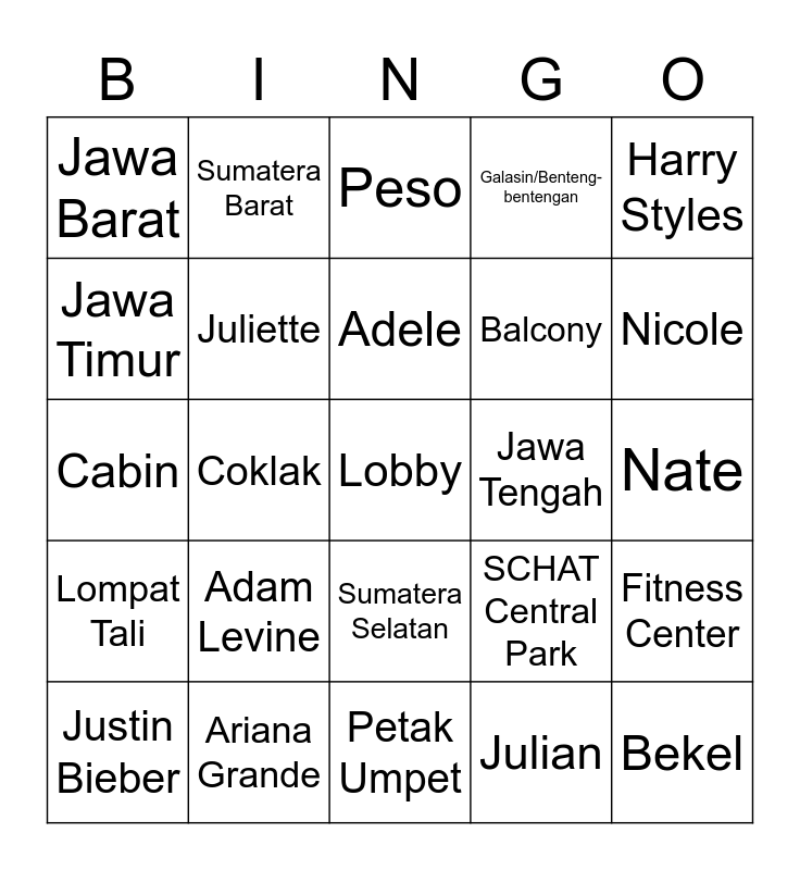 This bingo card has a free space and 24 words: Adam Levine, Ariana Grande, Adele, Justin Bieber, Harry Styles, Jawa Barat, Jawa Timur, Sumatera Barat, Jawa Tengah, Sumatera Selatan, Balcony, Cabin, SCHAT Central Park, Fitness Center, Juliette, Julian, Nate, Peso, Nicole, Coklak, Bekel, Lompat Tali, Galasin/Benteng-bentengan and Petak Umpet.