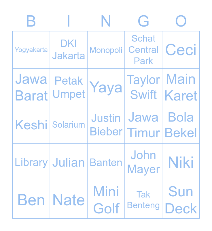 This bingo card has a free space and 24 words: Julian, Nate, Yaya, Ben, Ceci, Yogyakarta, Jawa Barat, DKI Jakarta, Jawa Timur, Banten, Taylor Swift, Keshi, John Mayer, Niki, Petak Umpet, Tak Benteng, Bola Bekel, Monopoli, Main Karet, Solarium, Sun Deck, Library, Schat Central Park and Mini Golf.