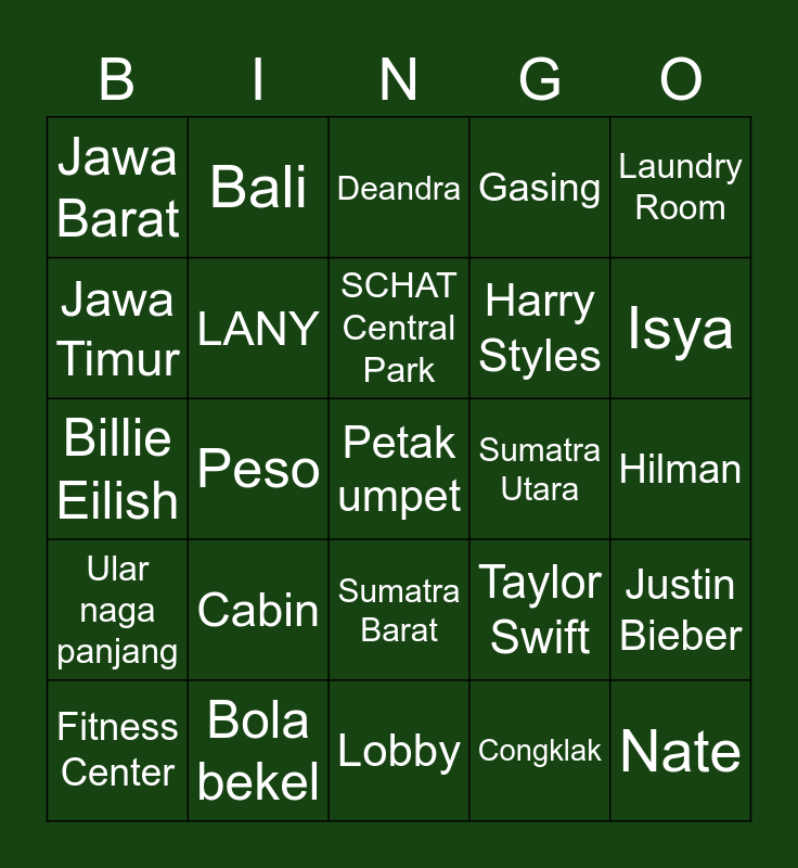 This bingo card has 25 words: Cabin, Lobby, SCHAT Central Park, Fitness Center, Laundry Room, Jawa Barat, Jawa Timur, Bali, Sumatra Utara, Sumatra Barat, Harry Styles, Billie Eilish, Taylor Swift, Justin Bieber, LANY, Nate, Hilman, Deandra, Isya, Peso, Petak umpet, Bola bekel, Ular naga panjang, Gasing and Congklak.