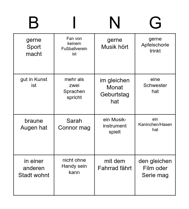 This bingo card has 16 words: nicht ohne Handy sein kann, ein Kaninchen/Hasen hat, gerne Musik hört, gerne Sport macht, braune Augen hat, Fan von keinem Fußballverein ist, ein Musik- instrument spielt, mit dem Fahrrad fährt, gut in Kunst ist, mehr als zwei Sprachen spricht, in einer anderen Stadt wohnt, gerne Apfelschorle trinkt, Sarah Connor mag, eine Schwester hat, im gleichen Monat Geburtstag hat and den gleichen Film oder Serie mag.