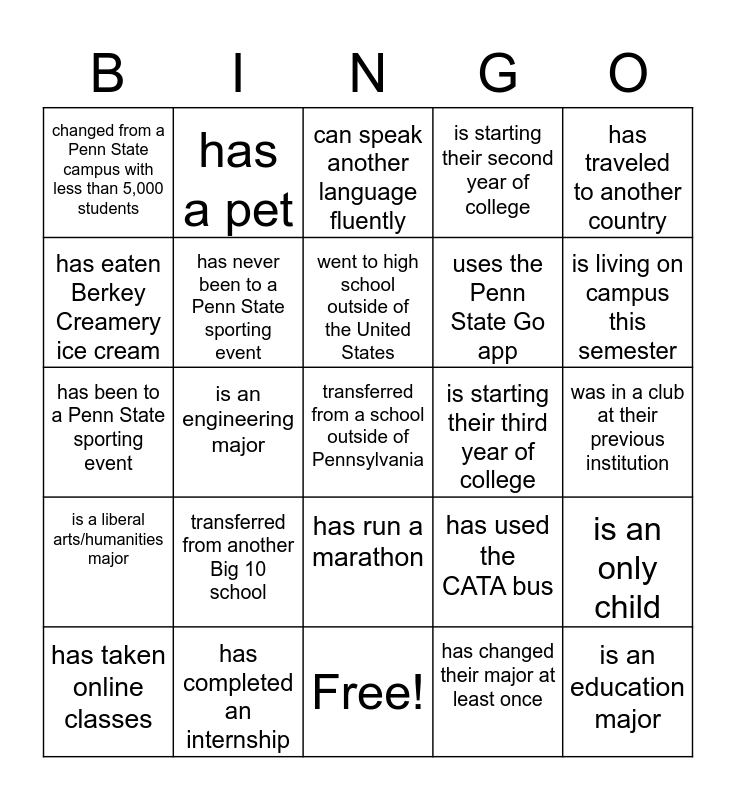 This bingo card has 29 words: has taken online classes, is living off campus this semester, is an engineering major, is an education major, changed from a Penn State campus with less than 5,000 students, can speak another language fluently, has never been to a Penn State sporting event, transferred from another Big 10 school, is starting their third year of college, has completed an internship, was in a club at their previous institution, transferred from a school outside of Pennsylvania, Free!, has changed their major at least once, is living on campus this semester, has performed on stage, has run a marathon, is a liberal arts/humanities major, has traveled to another country, has been to a Penn State sporting event, has used the CATA bus, has taken a picture with the Lion Shrine, uses the Penn State Go app, has eaten Berkey Creamery ice cream, is starting their second year of college, has a pet, is an only child, went to high school outside of the United States and doesn't drink coffee.