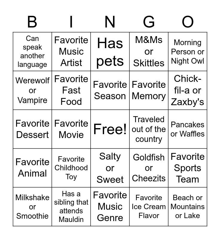 This bingo card has a free space and 30 words: Has a sibling that attends Mauldin, Favorite TV Show, Favorite Movie, Play a sport/instrument, Can speak another language, Has pets, Favorite Fast Food, Salty or Sweet, Traveled out of the country, Favorite Music Genre, Pancakes or Waffles, Beach or Mountains or Lake, Favorite Ice Cream Flavor, Favorite Game, Chick-fil-a or Zaxby's, Has a Special Talent, Goldfish or Cheezits, Favorite Animal, Favorite Childhood Toy, Morning Person or Night Owl, Favorite Dessert, Coke or Pepsi, Favorite Music Artist, Favorite Memory, Werewolf or Vampire, M&Ms or Skittles, Favorite Sports Team, Milkshake or Smoothie, Favorite Season and Favorite Cereal.