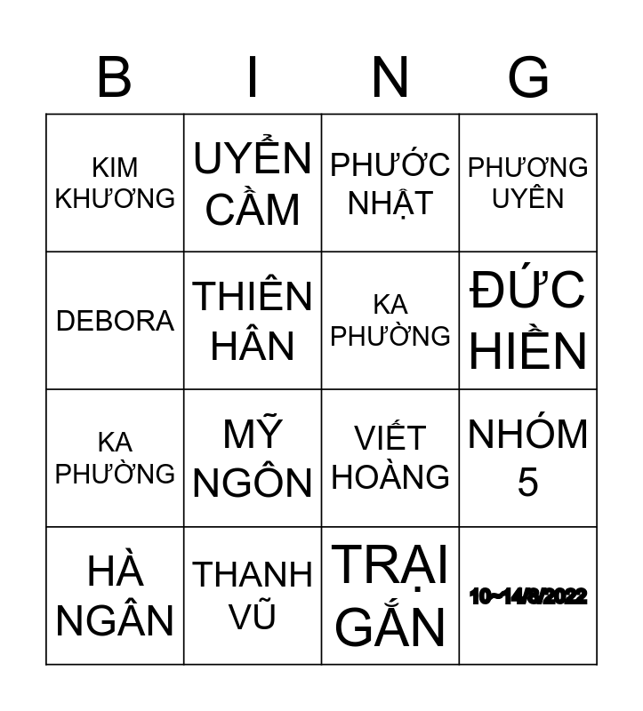 This bingo card has 16 words: THANH VŨ, NHÓM 5, PHƯỚC NHẬT, KIM KHƯƠNG, KA PHƯỜNG, UYỂN CẦM, VIẾT HOÀNG, TRẠI GẮN, DEBORA, THIÊN HÂN, HÀ NGÂN, PHƯƠNG UYÊN, MỸ NGÔN, ĐỨC HIỀN, KA PHƯỜNG and 10~14/8/2022.