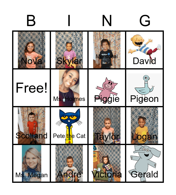 This bingo card has 15 images and 16 words: Andre, Logan, Mordecai, Nova, Scotland, Skylar, Taylor, Victoria, Free!, Ms. Holmes, Ms. Megan, David, Pete the Cat, Pigeon, Piggie and Gerald.