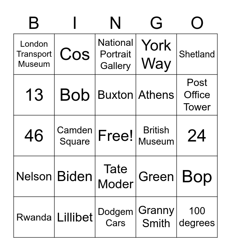 This bingo card has a free space and 37 words: Fox, Alfie, Everest, Bob, Bop, Biden, Buxton, Citron, Shetland, 50m, Camden Square, York Way, 100 degrees, 24, 13, Nelson, Royal Academy of Art, National Portrait Gallery, Tate Moder, British Museum, London Transport Museum, Post Office Tower, Rwanda, Dodgem Cars, Cervesa, Granny Smith, Cos, Crete, Kokos, Eurostar, Marilyn Monroe, Lillibet, 46, 4, Green, Athens and Istanbul.
