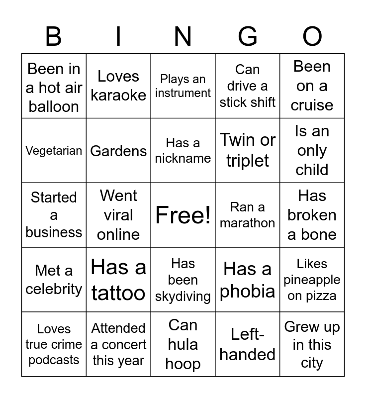 This bingo card has a free space and 34 words: Read 10+ books this year, Has a work playlist, Loves rollercoasters, Does Yoga, Has broken a bone, Vegetarian, Gardens, Can hula hoop, Twin or triplet, Grew up in this city, Started a business, Loves karaoke, Left-handed, Wears contacts, Met a celebrity, Went viral online, Has been skydiving, Ran a marathon, Likes pineapple on pizza, Loves true crime podcasts, Attended a concert this year, Speaks another language, Can drive a stick shift, Is an only child, Has a sweet tooth, Has a tattoo, Plays an instrument, Comes from a big family, Been on a cruise, Been in a hot air balloon, Traveled over the summer, Has a nickname, Has a phobia and Has the same birth month as you.