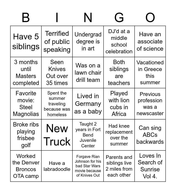 This bingo card has a free space and 24 words: New Truck, Have a labradoodle, Was on a lawn chair drill team, Worked the Denver Broncos OTA camp, Have an associate of science, Have 5 siblings, 3 months until Masters completed, Terrified of public speaking, Played with lion cubs in Africa, Taught 2 years in Fort Bend Juvenile Center, Both siblings are teachers, Favorite movie: Steel Magnolias, Had knee replacement over the summer, Can sing ABCs backwards, Seen Knives Out over 35 times, Parents and siblings live 2 miles from each other, Previous profession was a newscaster, Undergrad degree is in art, Vacationed in Greece this summer, Spent the summer traveling because was homeless, Loves In Search of Sunrise Vol 4., Broke ribs playing frisbee golf, DJ'd at a middle school celebration and Forgave Rian Johnson for his bad Star Wars movie because of Knives Out.