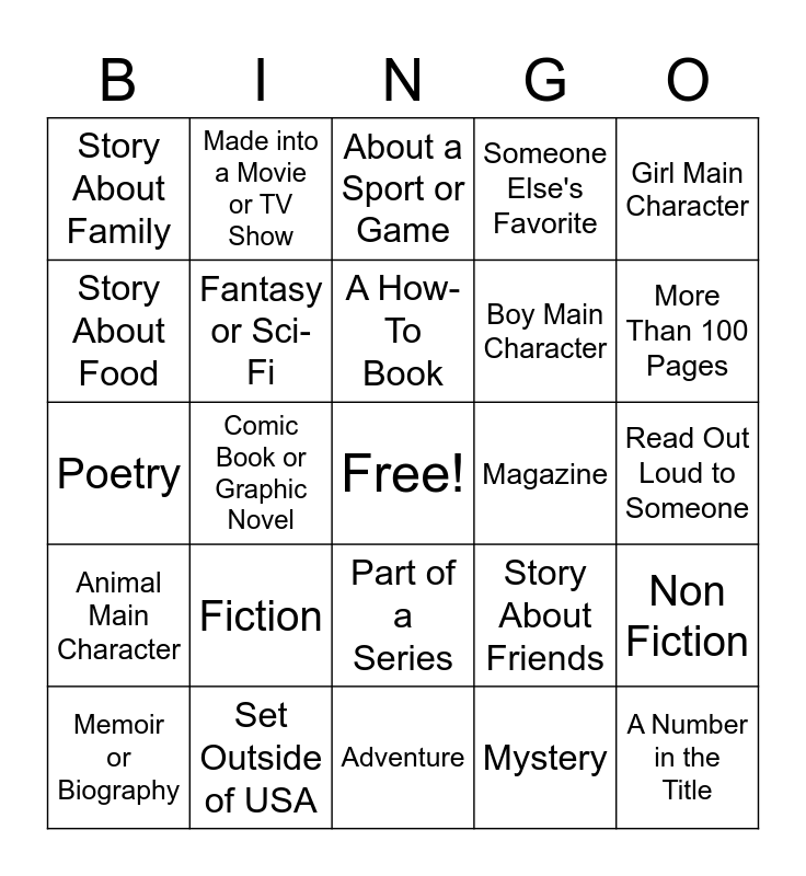 This bingo card has a free space and 24 words: Fiction, Set Outside of USA, A How-To Book, Memoir or Biography, Girl Main Character, Story About Family, Story About Food, Made into a Movie or TV Show, Magazine, Part of a Series, Boy Main Character, Poetry, Story About Friends, Non Fiction, Fantasy or Sci-Fi, Mystery, Read Out Loud to Someone, About a Sport or Game, More Than 100 Pages, Comic Book or Graphic Novel, A Number in the Title, Animal Main Character, Someone Else's Favorite and Adventure.