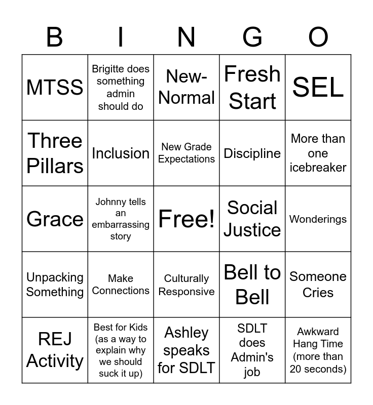This bingo card has a free space and 24 words: Make Connections, Best for Kids (as a way to explain why we should suck it up), New Grade Expectations, REJ Activity, SEL, MTSS, Three Pillars, Brigitte does something admin should do, Social Justice, Culturally Responsive, Discipline, Grace, Bell to Bell, Someone Cries, Inclusion, SDLT does Admin's job, Wonderings, New-Normal, More than one icebreaker, Johnny tells an embarrassing story, Awkward Hang Time (more than 20 seconds), Unpacking Something, Fresh Start and Ashley speaks for SDLT.