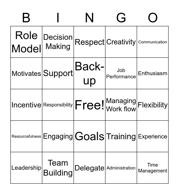 This bingo card has a free space and 24 words: Engaging, Team Building, Back-up, Leadership, Communication, Role Model, Motivates, Decision Making, Managing Work flow, Goals, Job Performance, Incentive, Training, Experience, Support, Administration, Flexibility, Respect, Enthusiasm, Responsibility, Time Management, Resourcefulness, Creativity and Delegate.